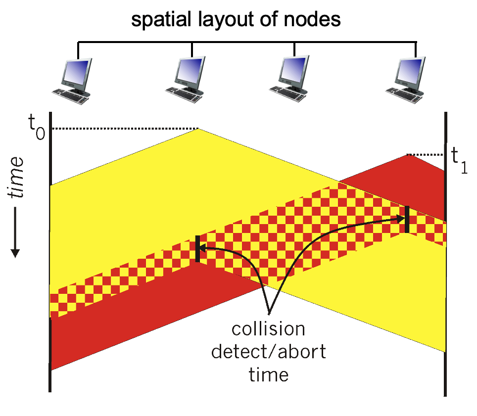위 그림에서 노드들은 충돌 검출을 수행하지 않는다. 두 번째 노드와 네 번째 노드 모두 충돌이 발생했음에도 불구하고 자신의 프레임 전체를 계속해서 전송한다.