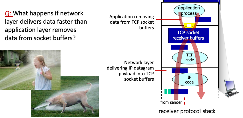 - 애플리케이션 계층에서 TCP 소켓 수신 버퍼에서 데이터를 읽는 속도가 데이터가 도착하는 것보다 비교적 느리다면, 송신자가 점점 더 많은 데이터를 빠르게 전송함으로 수신 버퍼에 오버플로가 발생할 것이다.