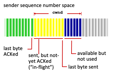 혼잡 제어는 cwnd로 표시되는 혼잡 윈도우(Congestion Window)를 추적한다. 이는 TCP 송신자가 네트워크로 트래픽을 전송할 수 있는 속도에 제약을 가한다. cwnd는 관찰된 네트워크 혼잡에 응답하여 동적으로 조정된다.