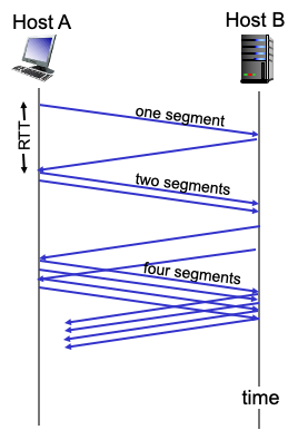 - Slow Start는 AIMD와 마찬가지로 패킷을 하나씩 보내면서 시작하고, 패킷이 문제없이 도착하면 각각의 ACK 패킷마다 cwnd 사이즈를 1씩 늘려준다. 즉 한 주기가 지나면 cwnd의 사이즈가 2배가 된다.