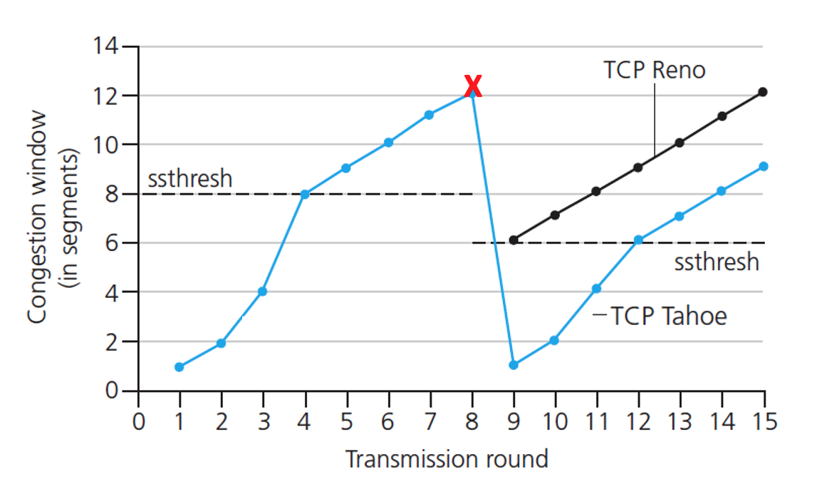 - 손실된 세그먼트에 대한 ACK이 도착하면 TCP는 cwnd 혼잡 회피 상태로 들어간다. 즉 cwnd 값은 1로 하고, ssthresh 값은 손실 이벤트가 발생할 때의 cwnd 값의 반으로 한다.