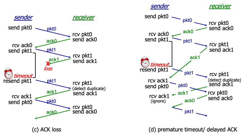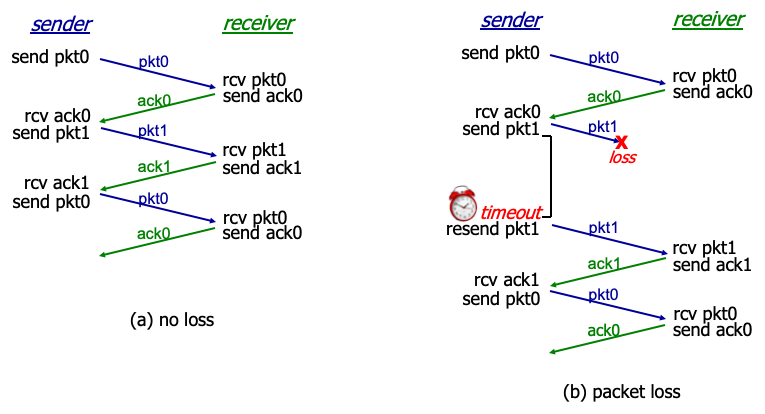 하위 채널이 패킷을 손실하는 경우를 생각해보자. 어떻게 패킷 손실을 검출할 것인가, 그리고 패킷 손실이 발생했을 때 어떻게 행동을 할 것인가를 다루어야 한다. 이를 다루기 위해 필요한 기술은 체크섬, 순서 번호, ACK 패킷, 재전송, 카운트다운 타이머가 있다. 송신자는 다음처럼 동작한다.