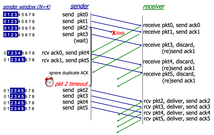 수신 측은 패킷의 순서번호가 맞지 않으면 오는 패킷을 받지도 않으며 확인 응답도 보내지 않고, 올바른 순서번호의 패킷을 받을 수 있을 때 까지 직전에 받은 확인 응답을 계속해서 보낸다. 하지만 송신측은 중복 확인 응답을 무시하고 보낸 패킷에 대해 확인 응답을 못받은 타임아웃이 일어나면 패킷을 재전송한다.
