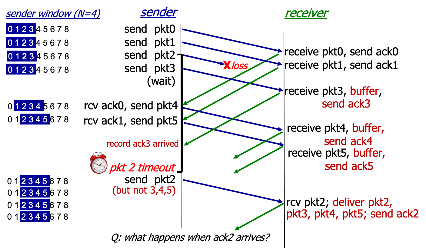 패킷 3, 4, 5를 받아 버퍼에 저장해 두었다가, 타임아웃으로 2를 받은 후에 2, 3, 4, 5를 상위 계층으로 전달한다.