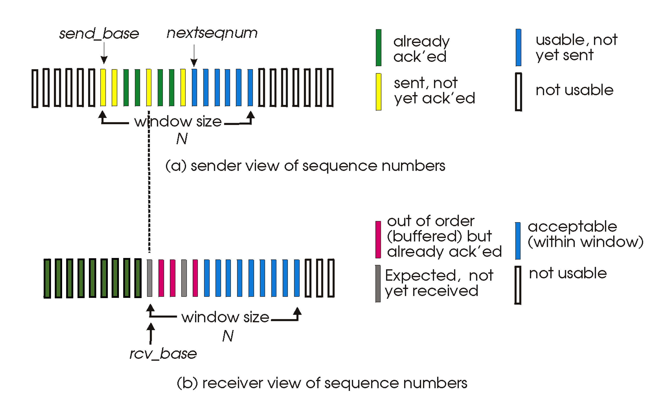 전송 되었지만 아직 확인응답이 안 된 패킷을 위해 허용할 수 있는 순서 번호의 범위는 순서 번호의 범위상에서 크기가 N인 윈도우로 나타낸다. 프로토콜이 동작할 때, 이 윈도우는 순서 번호 공간에서 오른쪽으로 슬라이딩한다. 이러한 이유로 N을 윈도우 크기라 부르며, GBN 프로토콜은 슬라이딩 윈도우 프로토콜이라고 부른다.