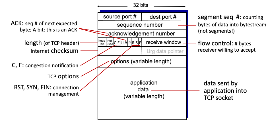 - 32비트 순서 번호 필드와 32비트 확인응답 번호 필드는 신뢰적인 데이터 전송 서비스 구현에서 TCP 송신자와 수신자에 의해 사용된다.