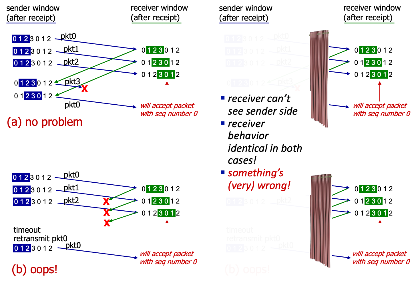 윈도우의 크기가 순서 번호 공간 크기의 절반보다 크다면, (b)의 상황과 같이 두 번째 0을 받아야 하는데 첫번째 0으로 재전송받게 될 수도 있다. 이런 오류가 없게 하기 위해서는 윈도우의 크기는 순서 번호 공간 크기의 절반보다 작아야한다.