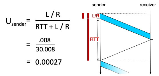 rdt3.0의 핵심적인 성능 문제는 stop-and-wait 프로토콜 이라는 점이다.