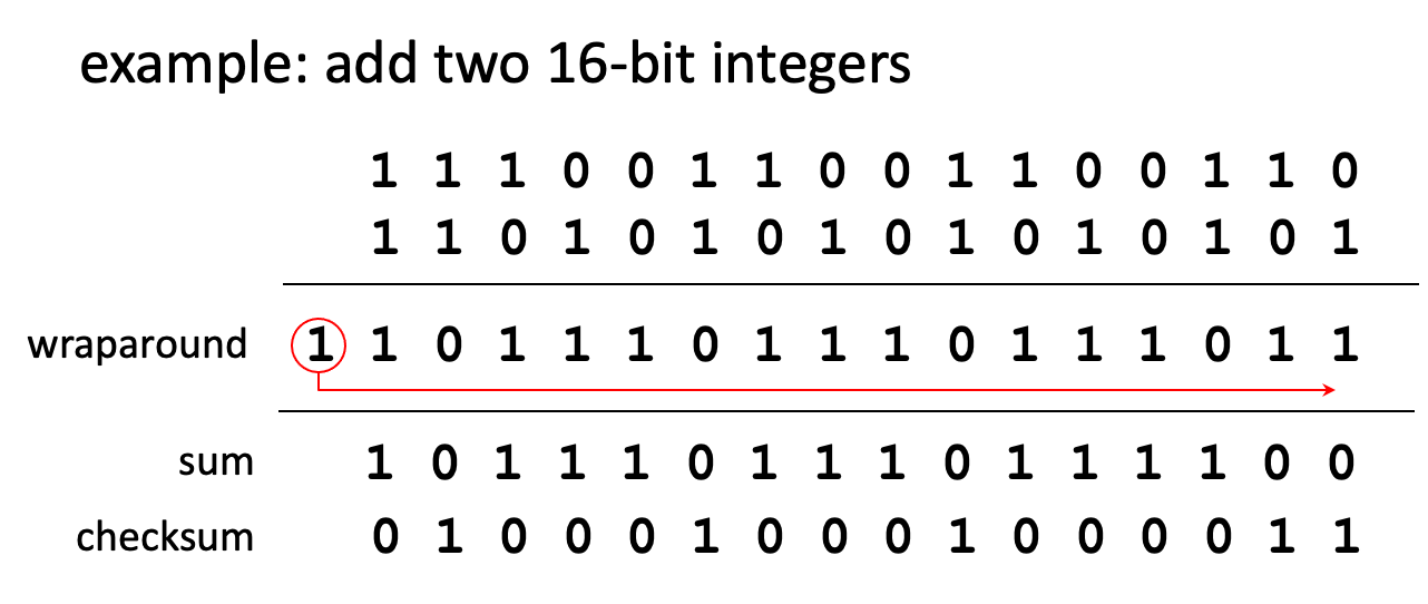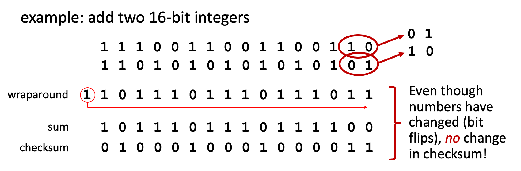 수신자에서는 체크섬을 포함한 모든 16비트 워드들이 더해진다. 만약 패킷에 어떤 오류도 없다면, 수신자에서의 합은 모든 비트가 1이 될 것이다. 만약 비트 중 하나라도 0이 있다면 오류가 발생했음을 할 수 있다. 하지만 체크섬 방식에는 취약한 점이 하나 있다. 수신 받은 패킷에 오류가 있더라도 모든 워드를 더했을 때 모든 비트가 1이 되는 상황이 있을 수 있기 때문이다.