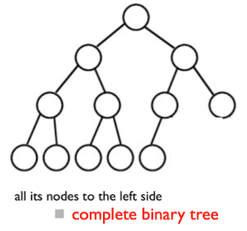 마지막 레벨을 제외한 모든 레벨에 최대 노드의 개수가 존재하는 트리. 마지막 레벨에는 노드들이 왼쪽으로 치우쳐 있다.