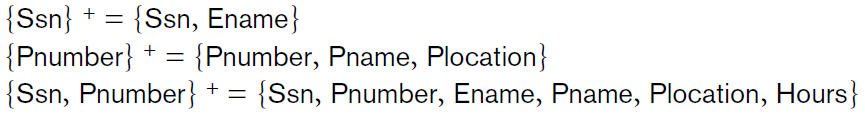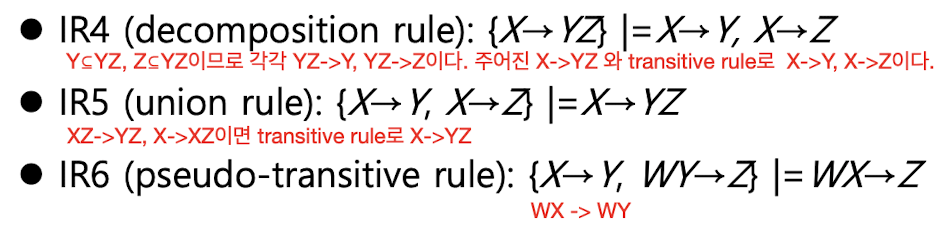 F+: F로부터 추론될 수 있는 모든 Dependency의 집합으로, F를 당연히 포함한다. 이를 F의 closure라고도 부른다.