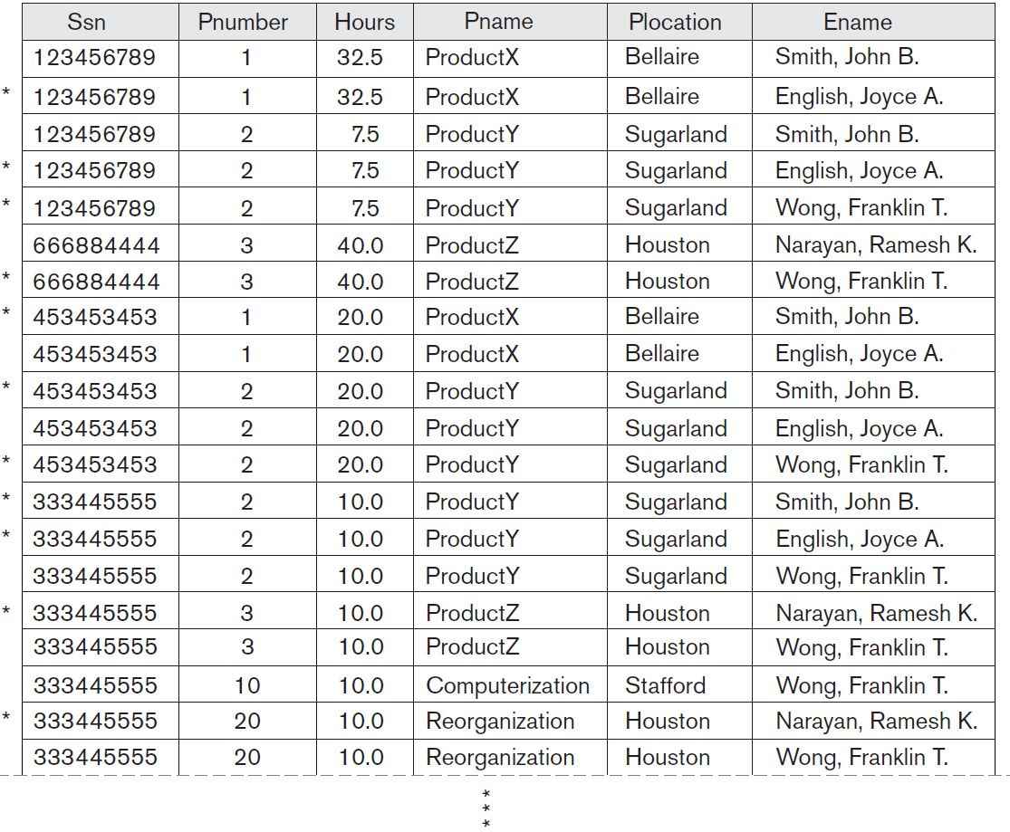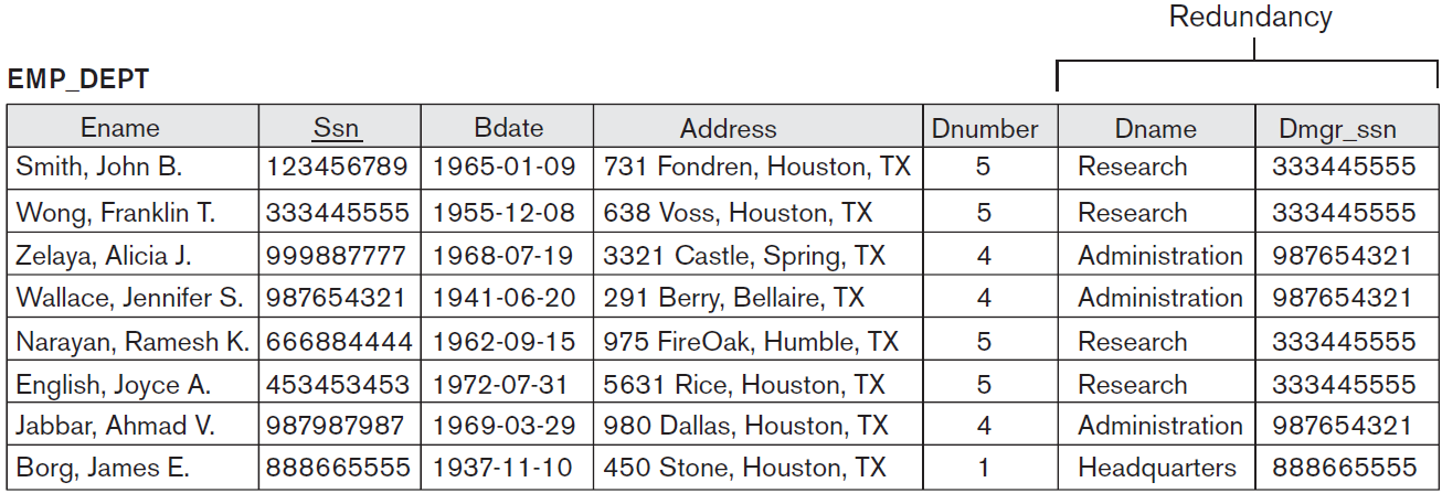 3. Modification Anomalies 한 tuple에서 Dmgr_ssn을 변경 하면 다른 tuple에 있는 것도 바꿔야하는 오버헤드