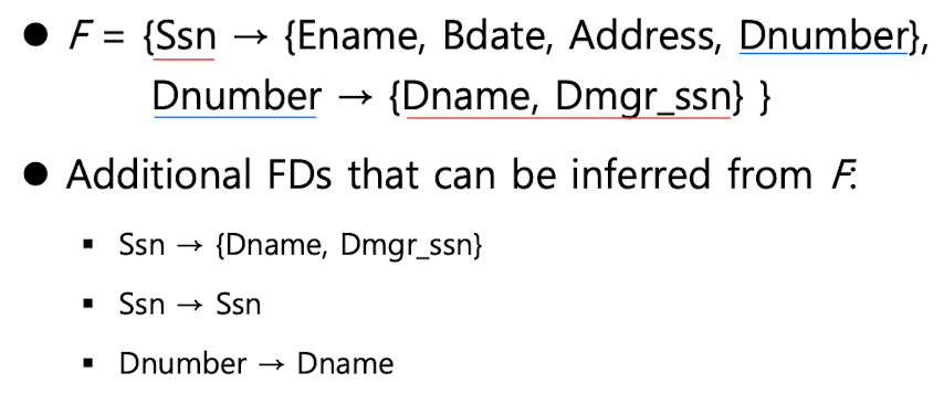 FD는 table schema R의 고유 특성이므로 table instance가 주어졌을 때 추론하는 것이 아닌, 데이터베이스를 설계하면서 정의된다.