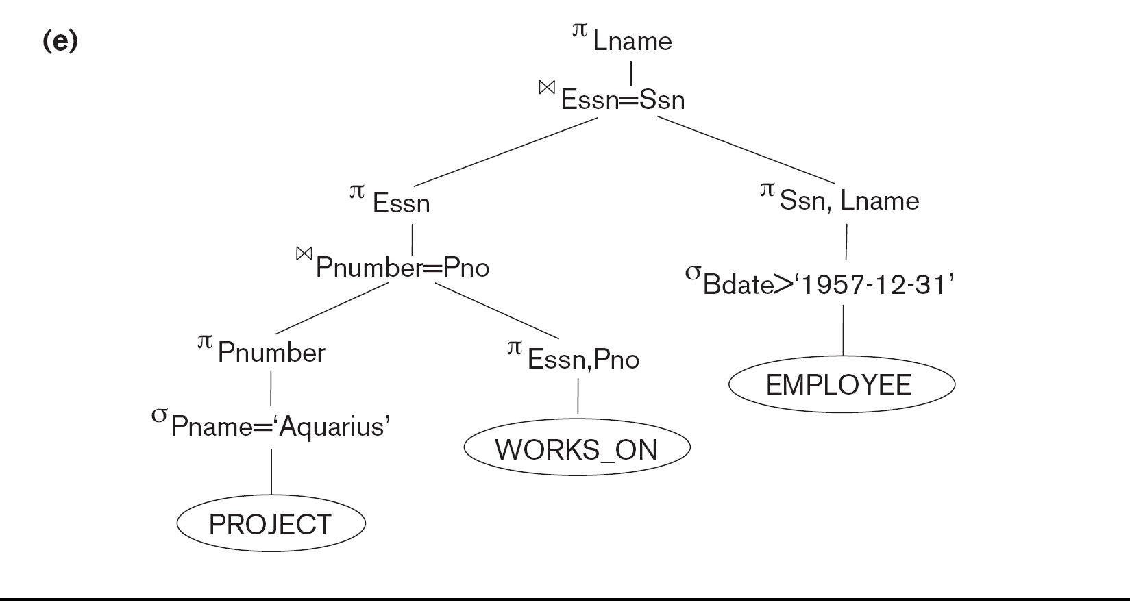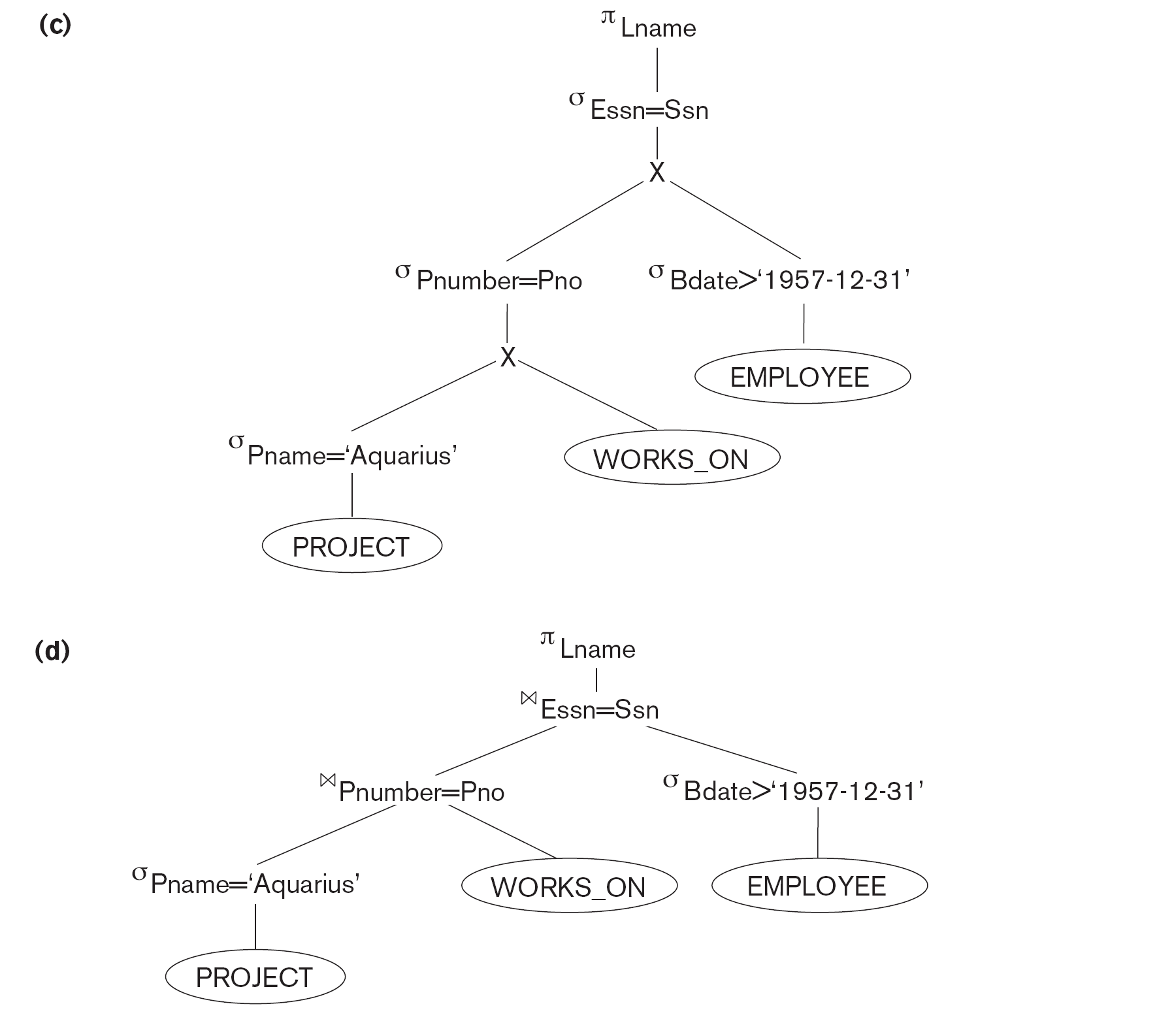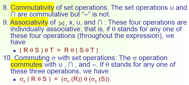 5. 교환법칙이 성립한다. JOIN의 경우에 한 쪽에 인덱스가 있을 경우, 없는 쪽에서 하나 선택 후, 이와 동일한 것을 인덱스 서치로 찾는 것이 성능 상 더 빠르다. CARTESIAN 연산의 경우에는 R이 메인 메모리에 한번에 올라갈 수 없을 정도로 크고 S는 메인 메모리에 한번에 올라갈 수 있을 경우, S의 한 Tuple을 기준으로 하여 R에 있는 Tuple과의 조합을 구하면 disk access가 많이 발생하지만, 반대로 R의 한 Tuple을 기준으로 S에 있는 Tuple과의 조합을 구하면 disk access가 상대적으로 조금 발생한다.