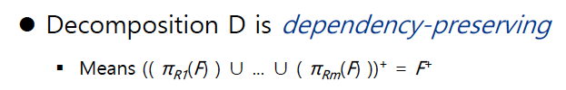 R의 Decomposition을 D = {R_1, R_2, ..., R_m}라고 할 때, F의 R_i Projection인 pi_(R_i)(F)들을 모두 Union 한 것의 Closure가 F의 Closure와 같다면, D는 Dependency-Preserving하다고 한다.