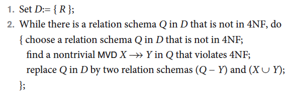 2. D에 4NF가 아닌 relation schema 가 있다면 다음을 반복한다.