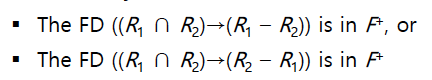Decomposition D = {R_1, R_2}는 R의 FD 집합 F에 관하여 Lossless Join Property를 가진다는 것을 다음 특징과 일맥상통한다.