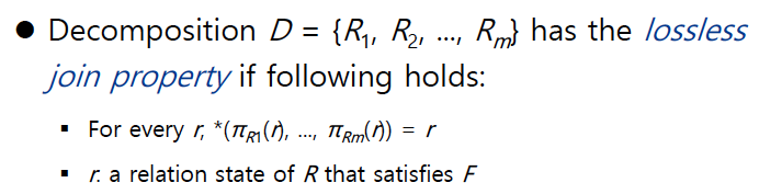 R의 Decomposition을 D = {R_1, R_2, ..., R_m}라고 할 때, r의 R_i Projection인 pi_(R_i)(r)들을 모두 Join 한 것이 r과 같다면 D가 Lossless Join Property를 가진다고 한다.