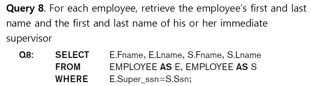 같은 attribute name을 서로 다른 relation에서 가지고 있는 게 허용 된다. 따라. 앞에 relation 이름을 써서 구분할 수도 있고 AS를 통해 별칭을 붙여 구분할 수도 있다.