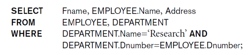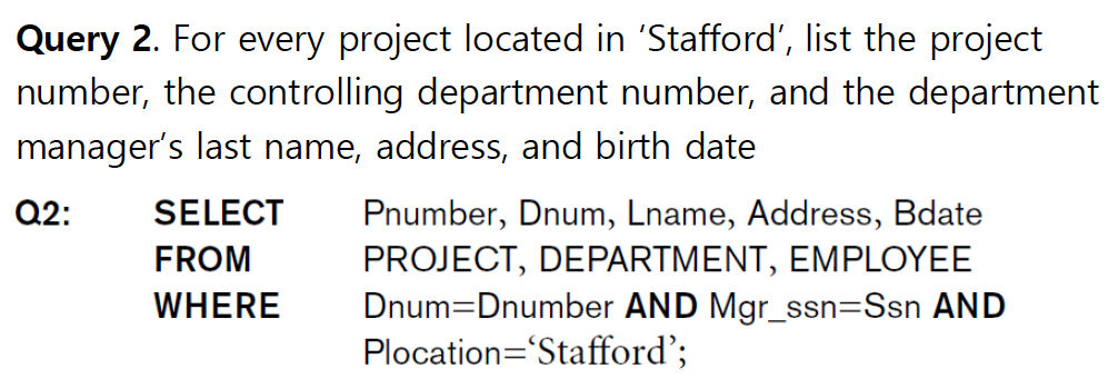 쉽게 생각 하자면, table list에 있는 table들을 CARTESIAN PRODUCT로 모든 조합을 만들고, condition으로 걸러낸 후, 보고 싶은 attribute를 attiribute list에 포함시키면 된다. condition에는 보통 FK = PK 조건과 찾고자 하는 tuple이 가지고 있는 특징이 조건으로 들어간다.