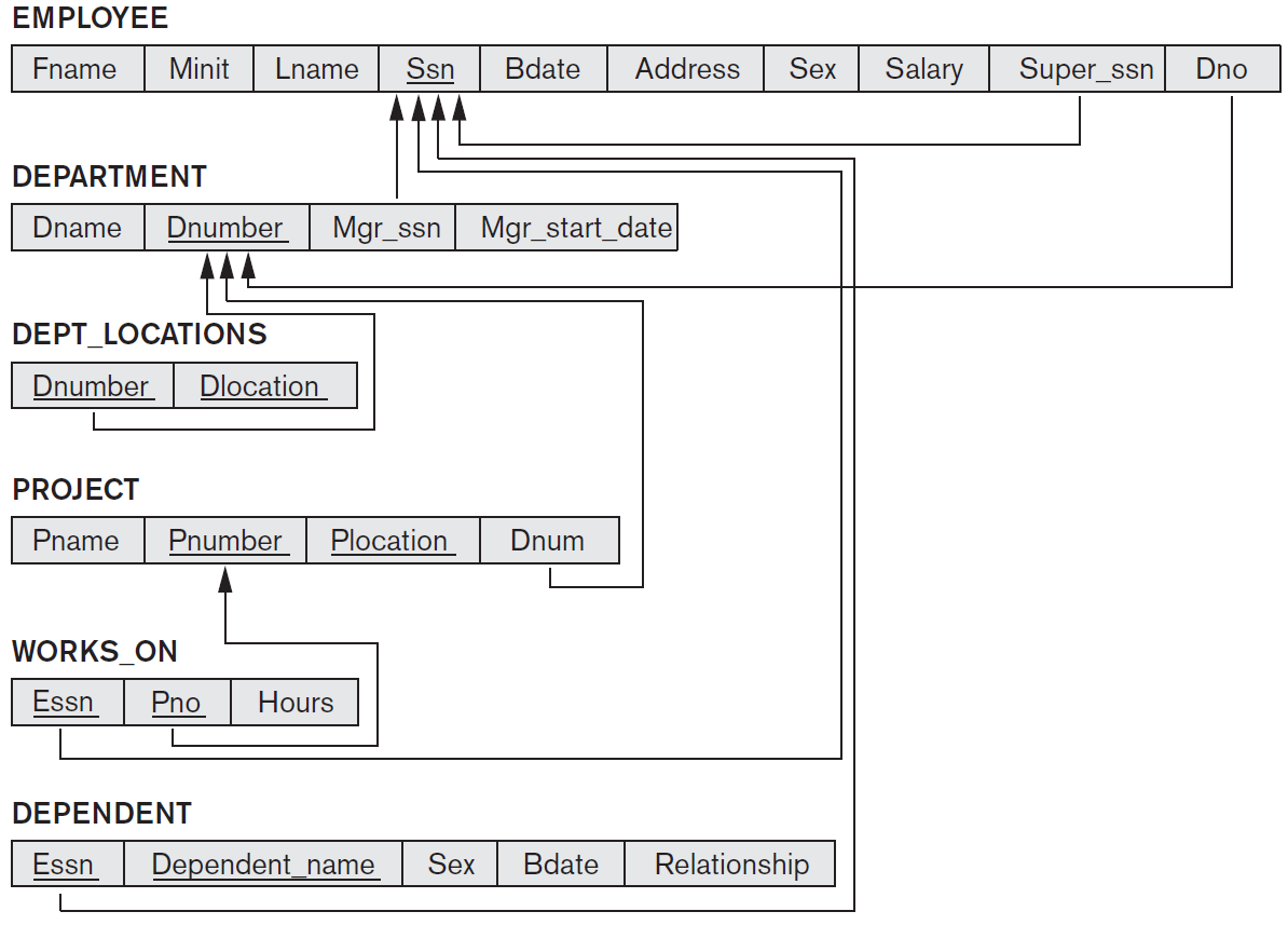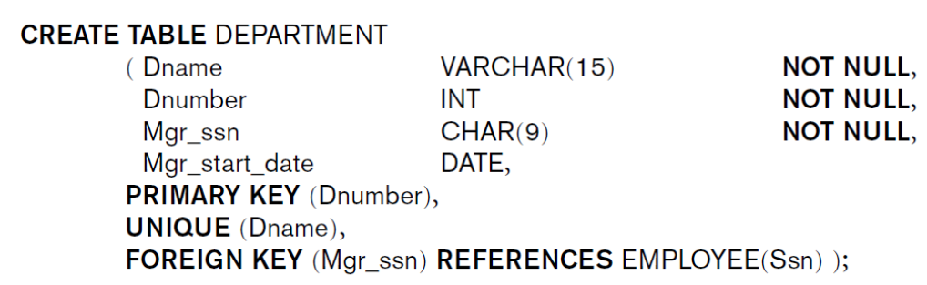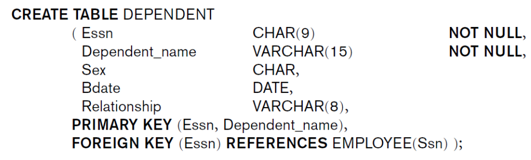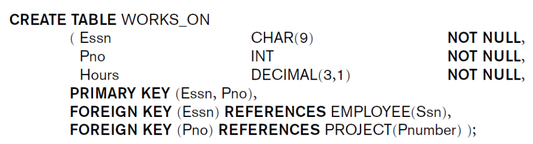 FOREIGN KEY: Referential integrity constraint을 위한 FK를 명세. Referential triggered action을 명세할 수 있다. (ON DELETE or ON UPDATE -> SET NULL or CASCADE or SET DEFAULT)