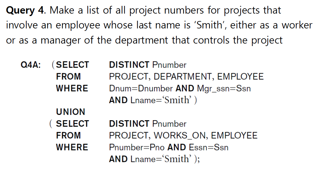 이 예제에서는 집합 연산을 하면 중복이 제거되기 때문에 DISTINCT가 없어도 결과는 똑같다.