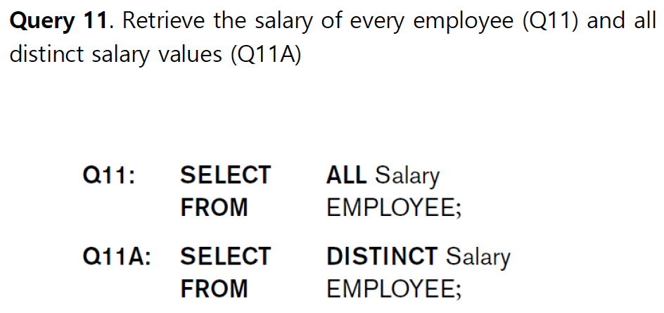 SELECT문의 결과는 중복을 허용한다. 하지만 집합처럼 중복을 없애고 싶다면 SELECT에 있는 attribute 앞에 DISTINCT를 붙여주면 된다. 아무것도 쓰지 않는다면 디폴트로 ALL이 적용된다.