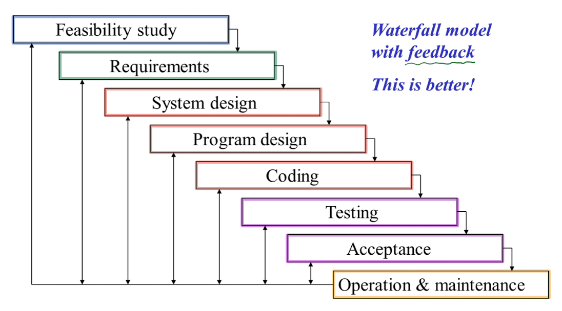 단점: 이전 단계로 돌아가서 수정하기 어렵다. 요구사항이 중간에 자주 변경될 프로젝트에 적합하지 않다. 동작하는 소프트웨어가 늦게 개발된다.